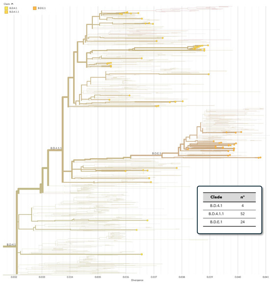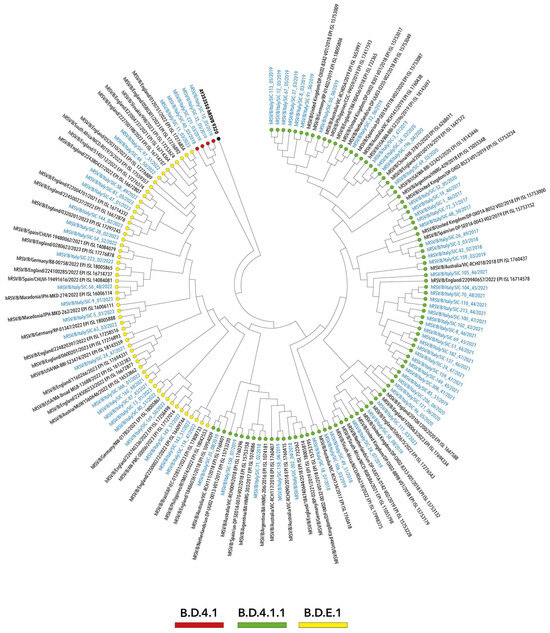 On the other hand, as depicted in Figure 2, hRSV-B genomes were classified as B.D.4.1 (n = 4), B.D.4.1.1 (n = 52) and B.D.E.1 (n = 24). These were aggregated in two main evolutive clusters, with the exception of a small number of ungrouped sequences. Altogether, hRSV-B strains belonged to the genotype GB.5.0.5.a (equivalent to BA9).
