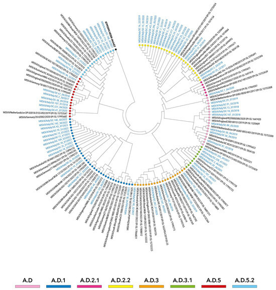 In particular, as illustrated in Figure 3, the clades A.D, A.D.2.1, A.D.2.2 and A.D.5 were mainly represented by hRSV-A strains that circulated between 2017 and 2018 and 2019 and 2020, whereas genomes obtained in more recent seasons (2021–2022 and 2022–2023) predominantly belonged to the clades A.D.1, A.D.3.1 and A.D.5.2 and were temporally consistent with other strains collected worldwide.