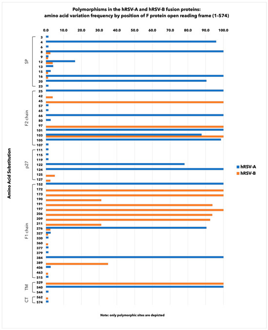 Amino acid variation frequencies detected in the F protein open reading frame of hRSV-A and hRSV-B Sicilian strains. Proportion of mutated AA positions: 6.3% for hRSV-A and 4.5% for hRSV-B.