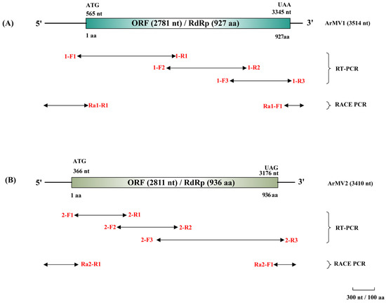 Diagrammatic sketch of RT-PCR and RACE of ArMV1 and ArMV2. (A) The genome organization and the polyprotein encoded by the ORF of ArMV1. (B) The genome organization and the polyprotein encoded by the ORF of ArMV2. The lines with a double arrow are the RT-PCR and RACE PCR products. The texts written in red show the names of the primers used.