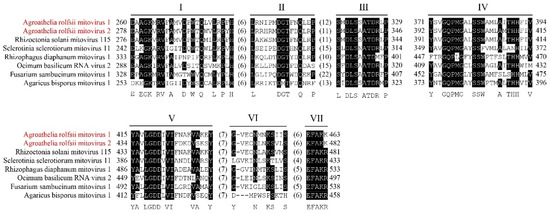 The amino acid sequence alignment of ArMV1 and ArMV1 with those mitoviruses from other fungal hosts (Table S5) indicated that there were seven highly conserved motifs (motif I to motif VII) in the RdRp protein of mitoviruses, as reported by previous studies; these include motif II (TFNQ), motif III (DLS and ATD), motif IV (GQP), motif V (GDD), and motif VII (EFAK) (Figure 2).