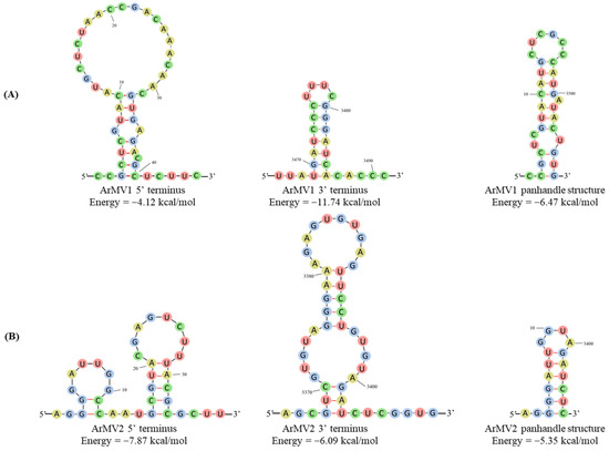 Predicted secondary structure: (A) the 5’ and 3’ termini and panhandle structures of ArMV1; and (B) the 5’ and 3’ termini and panhandle structures of ArMV2.