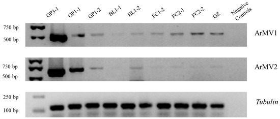 ArMV1 and ArMV2 were identified in the strains belonging to the same MCG as GP3-1. The maker used was the DL2000 maker.