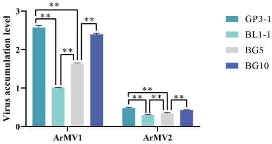 The difference in the level of ArMV1 and ArMV2 accumulation in GP3-1, BL1-1, BG5, and BG10. ** denotes p < 0.01.
