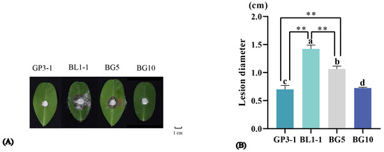 (A) Disease spots of Zhonghua 9 inoculated with GP3-1, BL1-1, BG5, and BG10 for 48 h. (B) The difference in the spot diameter of peanut infected by GP3-1, BL1-1, BG5, and BG10. ** denotes p < 0.01. a, b, c and d represents the lesion diameter of GP3-1, BL1-1, BG5 and BG10 respectively.