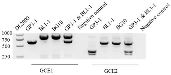 In order to determine whether genetic background affects the pathogenicity of BG5 and BG10, the PCR was amplified with the cDNA of GP3-1, BL1-1, and BG10, the mixed DNA of the GP3-1 and BL1-1 templates, respectively, and the specific primers GCE1-F, GCE1-R, GCE2-F, and GCE2-R (Table S1).
