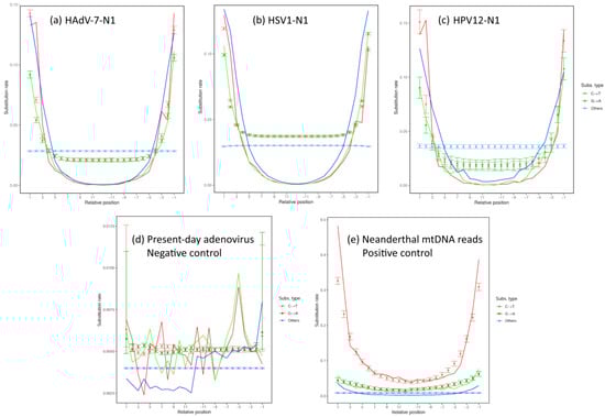 - Briggs, A.W.; Stenzel, U.; Johnson, P.L.F.; Green, R.E.; Kelso, J.; Prüfer, K.; Meyer, M.; Krause, J.; Ronan, M.T.; Lachmann, M.; et al. Patterns of Damage in Genomic DNA Sequences from a Neandertal. Proc. Natl. Acad. Sci. USA 2007, 104, 14616–14621. [Google Scholar] [CrossRef] [PubMed]