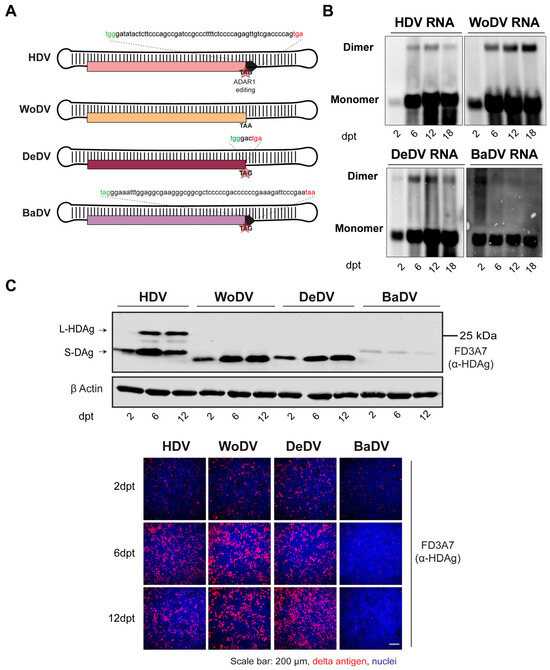 Characterization of antigenomic cDNA clones of the mammalian DLA identified in woodchuck (WoDV), deer (DeDV), and bat (BaDV). (A) Schematic representation of the putative large delta antigen generated by ADAR1 editing of the DLA genomes. (B) HuH7 cells were transfected with pcDNA3.1 plasmid harboring a 1.1-fold DLA antigenome and harvested at day 2-, 6-, 12-, and 18-p.t. for viral RNA detection by Northern blots using genome-specific DIG-labeled probes. (C) Delta antigen (DAg) expression was visualized via Western blot analysis (upper panel) or via immunofluorescence staining (lower panel) using FD3A7 anti-S-HDAg antibody at d2-, 6-, 12 p.t.