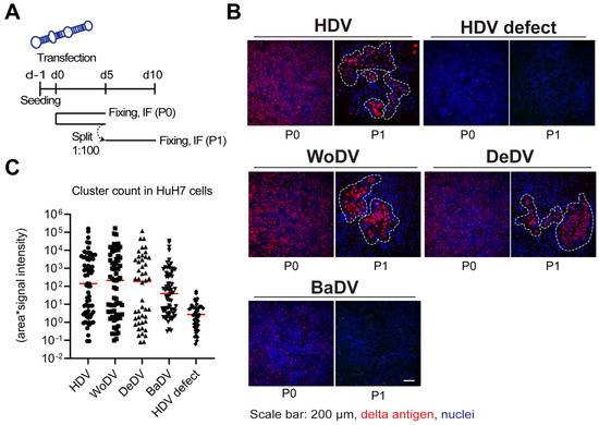 WoDV, DeDV, and BaDV cell division-mediated spread in HuH7 cells. (A) Cells were transfected with DLA constructs and split (1:100-dilution) at d5 p.t. (passage 0 = P0). Cells were fixed on day 5 p.t. or day 5 post passage (P1). (B) Delta antigen expression was visualized by immunofluorescence using FD3A7 antibody. (C) Delta antigen-positive cells were then quantified using Cell Profiler software 4.2.1. Quantification was carried out taking into consideration cluster size and mean signal intensity.