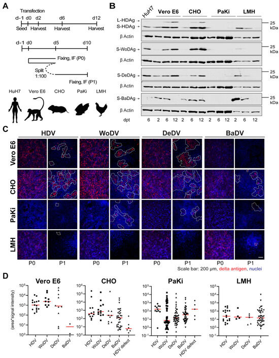 HDV and DLA viral antigen expression and cell division-mediated spread in different animal cell lines. (A) Vero E6, CHO, PaKi, and LMH cells were transfected with plasmids encoding the 1.1 antigenomic cDNA of HDV, WoDV, DeDV, and BaDV (upper panel, related to (B)). In parallel, cells were transfected and split (1:100-dilution) at d5 p.t. (passage 0 = P0) (lower panel, related to (C,D)). (B) Antigen expression was analyzed at d2, d6, and d12 p.t. following total cell lysis by WB. (C) At d5 p.t. or d5 post passage (P1), cells were fixed, and delta antigen expression was visualized by IF analysis using FD3A7 antibody. (D) Clusters of delta antigen-positive cells were quantified in terms of size and signal intensity using Cell Profiler software 4.2.1.