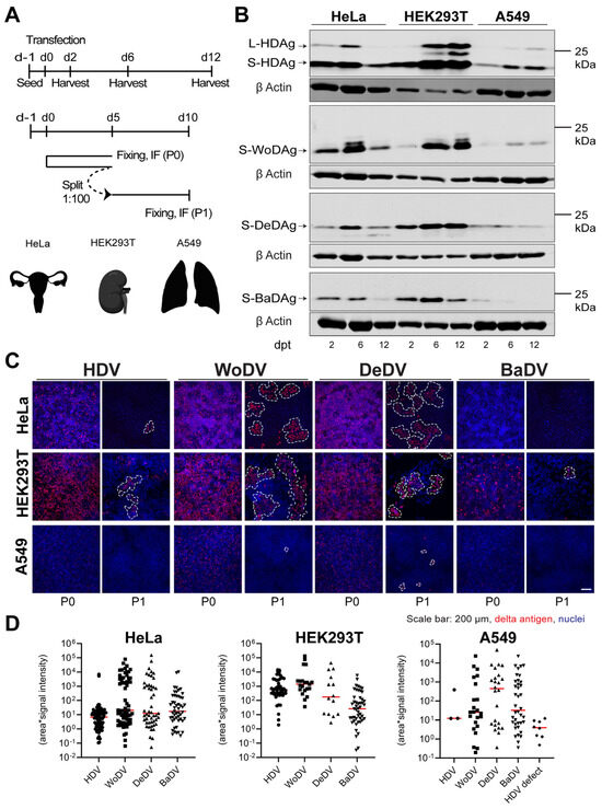 WoDV, DeDV, and BaDV viral antigen expression and cell division-mediated spread in non-hepatic human cells. (A) HeLa, HEK293T, and A549 cells were transfected with DLA 1.1mer antigenome constructs (upper panel, related to (B)). In parallel, cells were transfected and split (dilution factor 1:100) at day 5 p.t. (passage 0 = P0) (lower panel, related to (C,D)). (B) Delta antigen expression was analyzed at d2, d6, and d12 p.t. (C) At day 5 p.t. or day 5 post-passage (P1), cells were fixed and stained for delta antigen visualization by IF using FD3A7 antibody. (D) Cluster of delta antigen-positive cells were quantified using Cell Profiler software 4.2.1.