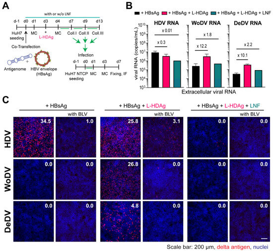 L-HDAg complementation and packaging by HBV envelope proteins. (A) HuH7 cells were co-transfected with DLA 1.1-mer antigenome constructs and pT7-HB2.7 plasmid with or without L-HDAg trans-complementation. (B) Supernatant from transfection was collected and, after PEG precipitation, the viral load was measured via RT-qPCR. (C) PEG precipitated virus was used to infect HuH7NTCP cells, and after 7 days, cells were fixed and stained for delta Ag visualization (FD3A7 anti-S-HDAg and Alexa Fluor 546-labeled anti-rabbit antibody). The first column represents infection performed with virus produced without L-HDAg complementation that was also performed in parallel with Bulevirtide (BLV) treatment (second column). The third and fourth columns depict infection with L-HDAg complemented virus with or without BLV treatment, respectively. The fifth and sixth columns depict infection with L-HDAg complemented virus and Lonafarnib (LNF) treatment (1 µM) to prevent farnesylation, with or without BLV treatment, respectively. Delta antigen-positive cells were quantified using the Ilastik program, as indicated by the percentage of infected cells.
