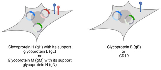 While few studies have been carried out about the gN-induced entry mechanism, we know of its susceptibility as a neutralisation target and its role in immune evasion [43,45]. It is expressed in a complex with glycoprotein M (gM). Together, gN and gM form the most abundant glycoprotein complex on HCMV virions [46]; they are conserved across the herpes virus family—however, not to the extent that cross-recognition by adaptive immune cells can be expected [43]. Glycoproteins gH and L (gL), as part of a complex, bind to platelet-derived growth factor receptor alpha (PDGFR-α) and allow viral membrane fusion and entry into the cell. In contrast to gB, which is responsible for viral fusion, this complex is required for cell-to-cell spread and allows spread within tissue [47].