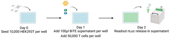 On day zero, 10,000 target cells are seeded in wells of a 96-well tissue culture plate in 100 µL of the medium without antibiotics (Figure 3). After 24 h, we added both 100 µL of the BiTE-containing supernatant and a 1:5 ratio of CB15 T cells matching the BiTE anti-CD3 domain. The co-culture was incubated under standard conditions for 24 h, the cell supernatant was harvested, and nLuc activity was measured using a luminometer. Experiments were performed as replicates of eight and repeated at least four times using the supernatant of independent BiTE products from independent transfections for each replicate. The results are visualised in Figure 7.