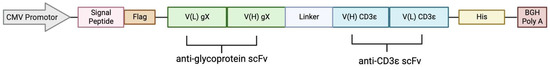The design of the BiTE expression vector with CMV promotor, signal peptide, Flag-tag, protein cassette comprised of VL VH, a GSG linker, His-tag, and BGH poly A.