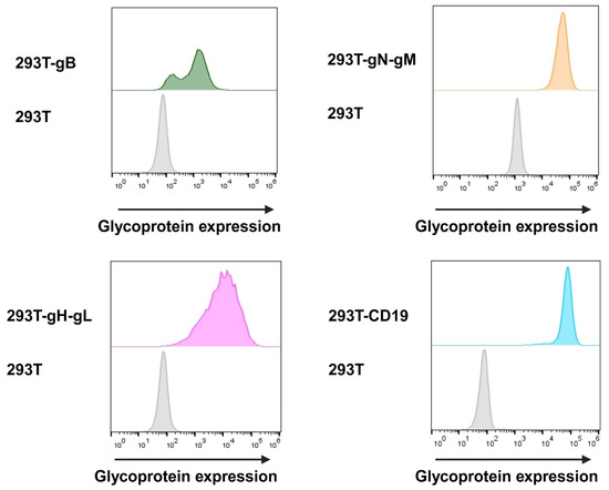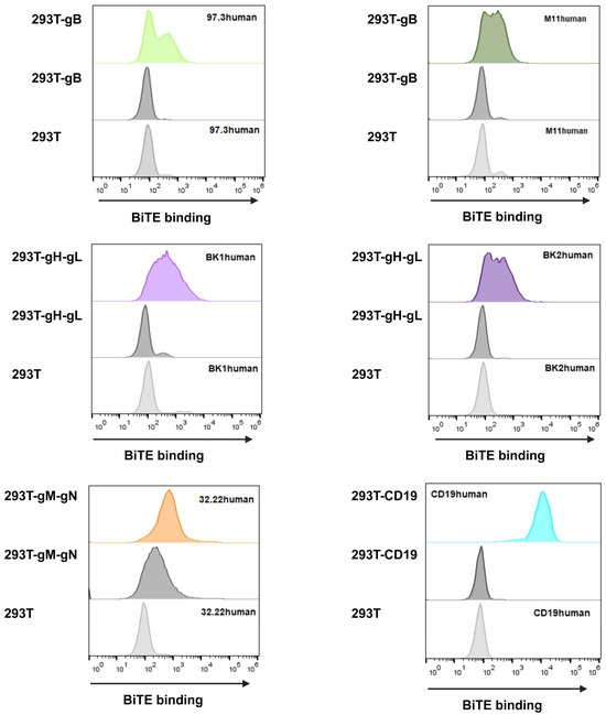 Since BiTE have a molecular mass of approximately 55 kDa, in roughly the same order as highly abundant serum proteins like albumin, they are hard to detect in culture supernatant even using their tags. For that reason, we aimed to prove the expression and binding in one. For our model system, we transduced target proteins’ expression vectors into HEK293T cells. Every protein-coding vector encodes a different antibiotic resistance; therefore, higher expression levels can be maintained under selective pressure. Furthermore, selection pressure allows the verification of the expression before conducting each assay. Glycoprotein targets gH and gN rely on gL and gM, respectively, for efficient surface presentation [55,56]. This was taken into consideration as seen in Figure 1.