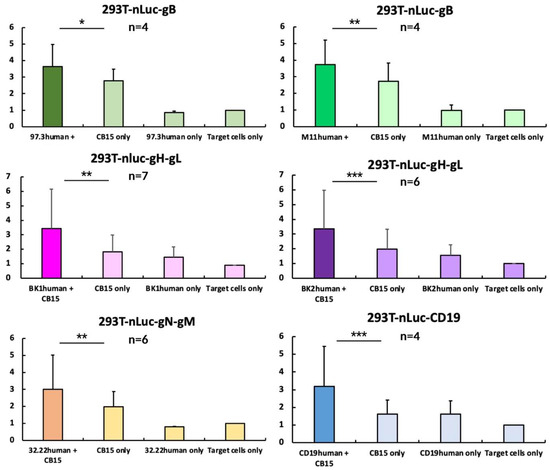 CB15 T-cell-induced killing assay. The indicated cell lines expressing viral glycoprotein complexes were incubated with CB15 T cells and BiTE. About 24 h later, supernatant was harvested and measured. For statistical analysis, measurements were normalised to nLuc-release upon addition of target cells alone and shown here via columns in mean (with 8 technical replicates per measurement). Error bars indicate standard error of mean. p-value was calculated using double-sided, unpaired Student’s t-test (* = p < 0.05; ** = p < 0.01; *** = p < 0.001). Exemplary individual measurements are depicted in Figure S6.