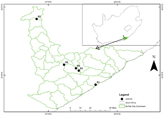 Geographical locations of selected wastewater treatment plants in Buffalo City Metropolitan Municipality. The WWTPs used in this study are located in S1, S2, S3, S4, and S5 in the Buffalo City Metropolitan Municipality in the Eastern Cape Province, South Africa. These plants discharge their final influents into the catchment areas listed in Table 1.