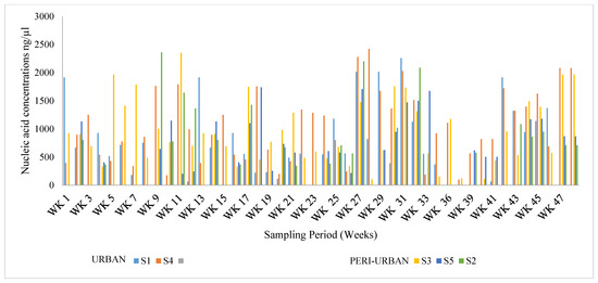 Total viral ribonucleic acids were extracted from a total of 100 mL processed wastewater samples over a period of 48 weeks. The extracted nucleic acid concentrations in Figure 2 revealed high concentrations between week 9 and week 13 more than 2.36 ng/µL, a significant decline in comparison with week 15 and week 17. Additionally, an increase in the total RNA concentration was subsequently observed between week 27 and week 33, with 2.48 and 2.25 respectively. This fluctuation is observed in low-income communities or peri-urban areas such as S3, S2, and S5, in which inadequately treated wastewater was occasionally released directly into the environment due to dysfunctional treatment plants in these sites and could potentially contaminate the groundwater. The majority of households in these areas utilize groundwater for various needs such as drinking, cooking, laundry, and other recreational purposes, resulting in potential SARS-CoV-2 viral transmission through infected and untreated groundwater as observed in S3 and S2 on the stipulated weeks, with approximately 2.34 × and 2.36 respectively. Although these concentrations represent the total RNA in a sample, a similar peak in the COVID-19 clinical cases from these sites was observed during the same period with a recorded total number of 2,511,178 and 2,889,298 infections, respectively [23].