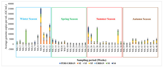The high viral loads obtained in the peri-urban facilities such as in sites S2 and S3 may be due to the high population size of the communities being served by these facilities. Another contributing factor could be the poor or complete lack of maintenance of infrastructure within these wastewater collection and treatment facilities, which, subsequently, results in the circulation and dissemination of the virus in the surrounding environment.