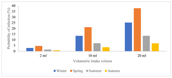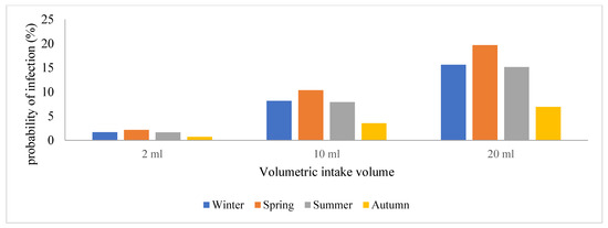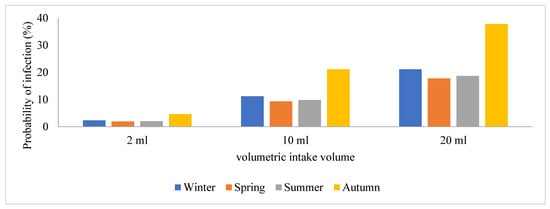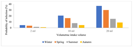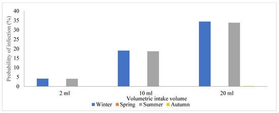 Due to the prevalence of SARS-CoV-2 in these areas, wastewater treatment plant operators are exposed to a significant risk of contracting the viral particles while performing their regular duties or routine maintenance. Hence, this study sought to estimate and assess the potential risks posed by SARS-CoV-2 to human health by conducting a quantitative microbiological risk assessment (QMRA). In this study, an exponential model for SARS-CoV-1 and the dose-response model with a k constant (4.1 × ) were used, and we generated a graph of volumetric intake against P(i) across the four seasons in Figure 4, Figure 5, Figure 6 and Figure 7. This model took a conservative approach to be protective of worker’s health by estimating the levels of potential risks posed by SARS-CoV-2 to their health, assuming different exposure scenarios [21]. Since SARS-CoV-2 incidence was identified through genome copies, it was assumed that aerosolized SARS-CoV-2 viral particles were introduced to wastewater treatment plant operators when performing their daily activities such as wastewater sampling and course screening.