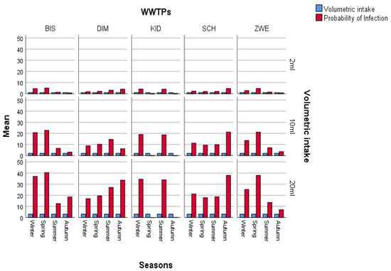 Previous QMRA studies have shown that a dose-response model for SARS-CoV-2 does not exist; hence, a dose-response model for SARS-CoV-1 was adopted and used as a substitute because of their similarities in structure and their ability to cause an infection, and this exponential model was used to determine the probability of SARS-CoV-2 particles to cause an infection on the wastewater treatment plant operators [15]. This is illustrated in Figure 5, Figure 6, Figure 7, Figure 8 and Figure 9, in which the probability of infection depends on the viral loads in that particular site and is expressed by the higher values of the probability of infection. Bayesian One-way ANOVA and general linear model (Univariate) were used on the IBM SPSS Statistics Data Editor to compare the level of significance with respect to the different seasons and with respect to different volumetric scenarios. The P(i) was highly significant (p < 0.001) for 20 mL as compared to other volume scenarios (Figure 9) and high P(i) was also observed in spring, autumn, and winter for all WWTPs. However, according to the Duncan plot, seasons were 0.01% significant on P(i). Hence, the P(i) was significantly different (p < 0.05) with respect to the different seasons as well as the different volumetric intake scenarios. Supplementary Table S1 summarizes the probability of infection, significance, and subset across all WWTPs from the different models used for statistical analysis. However, given varied assumptions and restrictions, the projected risk levels derived may have significant uncertainty, as determining exposure assessment for occupational risks in the sites is particularly a challenge due to the wide range of activities as well as seasonal changes. The fecal–oral route of transmission in low-income areas with insufficient sanitation infrastructure poses a major health hazard since untreated waste with potentially infective SARS-CoV-2 viral particles subsequently sets residents within the catchment area at a high risk of contracting the virus. SARS-CoV-2 infectivity results in COVID-19 dissemination in these environments, which remains a major global health concern to date.