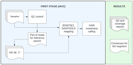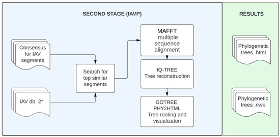 Two stages can be conditionally distinguished in the IAVCP pipeline: IAVC (IAV consensus)—to determine the consensus sequence from the HTS results, and IAVP (IAV phylogeny)—to theoretically recognize reassortment processes in the evolutionary history of the virus of interest. The workflows are shown schematically in Figure 1 and Figure 2. To use the pipeline, the Python interpreter should be installed together with the Conda or Mamba package manager. This ensures simple and efficient management of the environments and installation of the necessary dependencies for IAVCP. The pipeline is available for download from the GitHub repository (https://github.com/ana-way/IAVCP_workflow (accessed on 27 May 2024)).