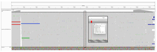 First, coinfection with closely related viruses that differ in a point mutation is possible. The reads from different viruses are then mapped to a reference. In our pipeline, this can be taken into account by changing the default value of the “Minimum frequency threshold” parameter [34]. This parameter defines the interpretation of reference sites for which different reads contain different nucleotides. The default value (0) means that only the most strongly represented nucleotide in this ambiguous site is taken into account. Increasing this parameter makes it possible to use several nucleotides at this position. Implementing the parameter “minimum frequency threshold” with the value 0 for a position with 83 adenosines, 15 cytidines, and 4 guanosines would result in the adenosine being fixed at this position of the consensus sequence. At the same time, the implementation of this parameter with the value 0.9 would result in the degenerate letter “M” (“A” or “T”) being fixed at this position of the consensus sequence. In other words, the appearance of the degenerate nucleotides in the consensus sequence as a result of the change in the “minimum frequency threshold” may be an indication of coinfection by closely related viruses in the sample.