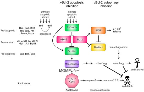 Apoptosis is critical in metazoans for maintaining healthy cell populations by silently clearing unwanted cells following development or destroying damaged cells [,,,]. Dysregulation of apoptosis has been shown to be important in many disorders including cancer and autoimmune and developmental diseases, as well as being a fundamental aspect of viral infection and replication [,,,,,]. Apoptosis is regulated via two main pathways: the extrinsic or death receptor-mediated pathway [] and the intrinsic or mitochondrially mediated pathway [,]. The latter pathway is controlled by the interplay of Bcl-2 proteins, and both pathways converge at the level of caspases, where a hierarchical protease cascade commencing with initiator caspases is initiated that triggers the activation of executioner caspases, which ultimately dismantle the cell. Extrinsic apoptosis has been recently reviewed in [] and, here, we focus on the role of viral Bcl-2 proteins in intrinsic apoptosis and their potential role in autophagy.
