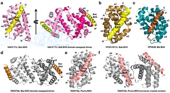 Poxvirus-encoded Bcl-2 proteins are protomerically divergent and may exist as monomers or domain-swapped dimers. Cartoon representation of a comparison of different poxvirus Bcl-2 proteins. Although the protomer structure varies, the BH3 ligand binds in the BH3 binding groove provided by the Bcl-2 homolog. (a) Structure of vaccinia virus (VACV) F1L (pink) in complex with Bak BH3 peptide (yellow) (PDB ID 4D2L) []. VACV F1L helices are labeled α1–α7. The view on the left in (a) is of the hydrophobic binding groove formed by helices α2–α5 of a protomer. On the right, the view is down the 2-fold symmetry axis between the domain-swapped α1 helices of the dimer. The second protomer is colored dark pink. The vertical arrow represents the axis of rotation and the broad arrow the rotation about the axis. (b) Myxoma virus (MYXV) M11L (sand) in complex with the Bak BH3 peptide (yellow) (PDB ID 2JBY) []. (c) Fowl poxvirus FPV039 (teal) in complex with the Bik BH3 peptide (brown) (PDB ID 5TZP) []. (d) Tanapoxvirus TANV16L (grey) domain-swapped dimer in complex with the Bax BH3 peptide (dark orange) (PDB ID 6TRR). (e) TANV16L (grey) monomer in complex with the Puma BH3 peptide (salmon) (PDB ID 6TQP). (f) TANV16L (grey) in complex with the Puma BH3 peptide (salmon) (PDB ID 6TQP), showing the crystal packing contacts of the neighboring protomer [].