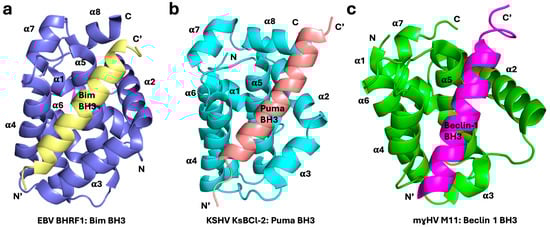 Structural comparison of herpesviral Bcl-2:BH3 peptide complexes. Cartoon diagrams of monomeric complexes in the Bcl-2 proteins. (a) Epstein–Barr virus BHRF1 (slate) in complex with Bim BH3 peptide (pale yellow) (PDB ID 2V6Q) []. (b) Kaposi sarcoma-associated herpesvirus KsBcl-2 (cyan) in complex with Puma BH3 peptide (salmon) (PDB ID 7QTX) []. (c) Murine gammaherpesvirus M11 (green) in complex with Beclin 1 BH3 peptide (magenta) (PDB ID 3DVU) []. The orientation of the cartoons is identical to that of Figure 3a.