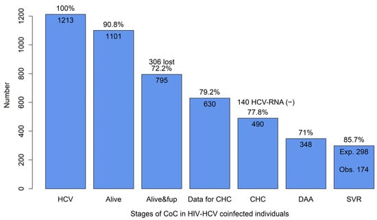 Stages of cascade of care in HIV/HCV co-infected individuals. All percentages were evaluated with respect to the number of individuals in the previous stage. HCV: hepatitis C virus; CHC: chronic hepatitis C; DAA: direct-acting antivirals; SVR: sustained virological response; Exp.: expected; Obs.: observed; CoC: cascade of care.