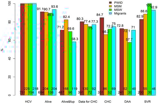 Stages of cascade of care in HIV/HCV co-infected by risk group: PWID in brown, MSM in orange, MSW in green, and migrants in cyan. All percentages were evaluated with respect to the number of individuals in the previous stage. The respective numbers for each group are presented at the bottom of each bar. PWID: people who inject drugs; MSM: men who have sex with men; MSW: sex between men and women; HCV: hepatitis C virus; fup: under follow-up; CHC: chronic hepatitis C; DAA: direct-acting antivirals; SVR: sustained virological response.