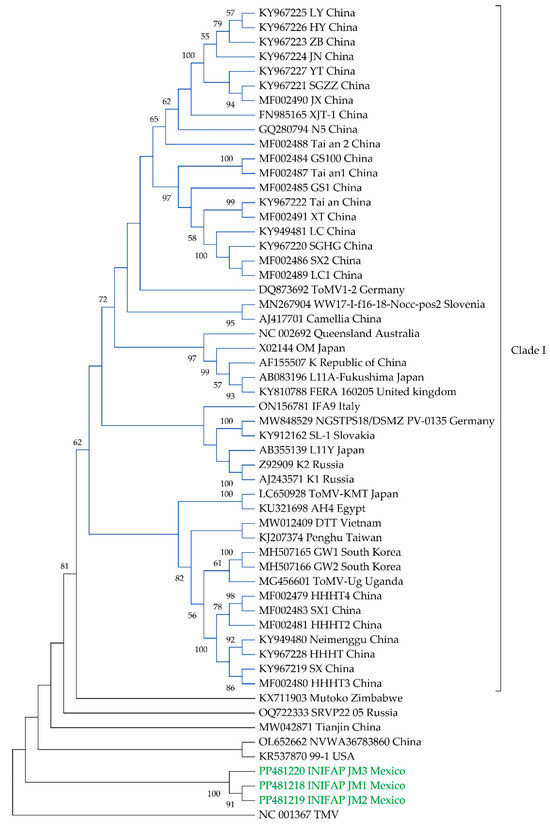 The Tamura–Nei model [41] with gamma-distributed rates and invariant sites was determined to be the best-fitting nucleotide substitution model for phylogenetic analysis. Phylogenetic analysis revealed that the INIFAP JM1–3 isolates clustered in a compact group outside the principal clade containing 47 of the ToMV strains from China, Japan, Australia, Germany, Russia, Republic of Korea, and other countries (Clade I). The other eight isolates formed separate branches outside this principal clade, including the Mexican isolates (Figure 1).