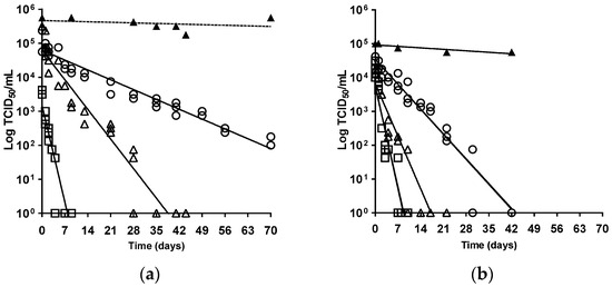 Linear regression for virus kinetics profiles for (a) H5N8-2020; (b) H5N1-2021 survival on MDCK cell monolayers in serum-free EMEM with penicillin and streptomycin. Logarithm TCID50/mL was plotted versus the time in days at 4 °C (±2 °C), 20 °C (±2 °C), and 30 °C (±2 °C). Symbols: at 4 °C, ∆ at 20 °C, □ at 30 °C, ▲ positive controls (no incubation treatment) assessed per virus per batch of MDCK cell monolayers. For all isolates evaluated, mean R2 0.91, p < 0.0001.