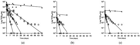 Linear regression for virus kinetics profiles for (a) H5N8-2016; (b) H5N8-2014; (c) H5N6-2017 survival, on MDCK cell monolayers in serum-free EMEM with penicillin and streptomycin. Logarithm TCID50/mL was plotted versus the time in days at 4 °C (±2 °C), 20 °C (±2 °C), and 30 °C (±2 °C). Symbols: at 4 °C, ∆ at 20 °C, □ at 30 °C, ▲ positive controls (no incubation treatment) assessed per virus per batch of MDCK cell monolayers. For all isolates evaluated, mean R2 0.91, p < 0.0001.