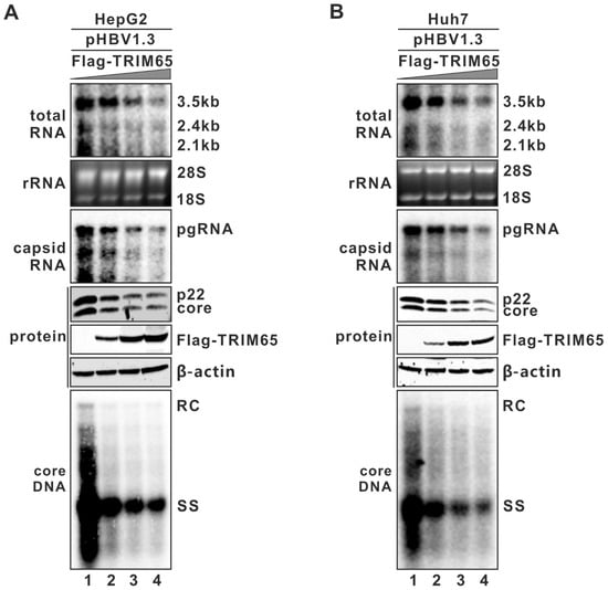 HBx selectively transactivates HBV transcription from episomal DNA templates including the authentic cccDNA and the transfected HBV plasmid [50,56,57,58]. Previous studies have reported that several TRIMs (5γ, 21, 31) inhibit HBV transcription through interacting with HBx and promoting its degradation [27,28,29]. We thus assessed the dependency on HBx for the TRIM65-mediated antiviral effect in HepG2 cells transfected with TRIM65 plus pHBV1.3 or the HBx-null mutant pHBV1.3Δx. As shown in Figure 4A, the level of transcribed viral RNA was lower in the pHBV1.3Δx-transfected cells compared to that with pHBV1.3 transfection due to the loss of HBx (lane 3 vs. 1); however, TRIM65 remained functional in reducing HBV-plasmid-based viral RNA transcription and core DNA replication in the absence of HBx expression (lane 4 vs. 3), indicating an HBx-independent antiviral mechanism of TRIM65 (Figure 4A).