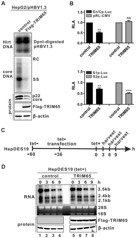 TRIM65 inhibits HBV replication at viral transcriptional level. (A) TRIM65 does not reduce the levels of transfected pHBV1.3 transcription template. HepG2 cells in 35 mm dishes were co-transfected with 2 µg of plasmid pHBV1.3 and 2 µg of control vector or plasmid FLAG-TRIM65. The cells were harvested on day 5 post-transfection and were subjected to Hirt DNA extraction. The Hirt DNA was then incubated with restriction enzyme Dpn I to digest the bacteria-derived plasmid DNA with Dam methylation. The Dpn I-digested Hirt DNA samples and the cytoplasmic HBV core DNA were analyzed by Southern blot. Viral p22 and core proteins, FLAG-tagged TRIM65, and β-actin were analyzed by Western blot. (B) TRIM65 inhibits HBV promoter activity. HepG2 cells seeded in a 96-well plate were co-transfected with 100 ng of EnII/Cp-Luc and 4 ng of pRL-CMV, plus 100 ng of control vector or plasmid FLAG-TRIM65. In separate wells, HepG2 cells were transfected with 100 ng of S1p-Luc or S2p-Luc, together with 100 ng of control vector or FLAG-TRIM65, with 4 ng of pRL-CMV also included in each transfection for normalization of transfection efficiency. Three days after transfection, cells were harvested, and luciferase activities were measured. The plotted relative luciferase activity (RLA) represents the mean ± standard deviation (SD, n = 3) of the ratios of absorbance obtained from wells expressing FLAG-TRIM65 over that obtained from wells that were transfected with control vector. ** p < 0.01; *** p < 0.001. (C) Schematic illustration of experimental design. HepDES19 cells were seeded in a 35 mm dish and cultured with tet-free medium to induce HBV RNA expression. Then, 24 h later, cells were transfected with 4 µg of control vector or plasmid FLAG-TRIM65 for 36 h; tet was added back to the culture medium to shut down pgRNA transcription; and cells were harvested at indicated time points. (D) TRIM65 does not promote HBV RNA decay in cell cultures. HBV RNA was extracted from harvested samples in (C) and analyzed by Northern blot. The expression of FLAG-TRIM65 was detected by Western blot, while β-actin served as loading control.