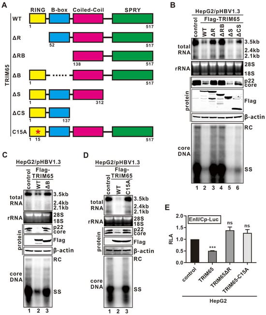 TRIM65 contains four conserved domains from the N- to the C-terminus, including a RING finger domain, a B-box domain, a coiled-coil domain, and a C-terminal SPRY domain (Figure 3A) [15,16]. To determine the functional domain(s) which is responsible for TRIM65’s antiviral activity against HBV transcription, a serial of TRIM65 mutants with deletion of each individual functional domain was constructed; in addition, a key cysteine residue 15 in the RING finger domain essential for E3 ubiquitin ligase activity was mutated into alanine, giving rise to the E3-inactive mutant TRIM65C15A [54,55] (Figure 3A). The WT TRIM65 and the mutants were individually co-transfected with pHBV1.3 into the HepG2 cells, and their effects on viral RNA and DNA were evaluated. As shown in Figure 3B,C, while the WT TRIM65 efficiently inhibited HBV transcription, deletion of the RING finger domain and/or B-box domain, but not the coiled-coil domain or SPRY domain, completely abolished TRIM65’s antiviral effect. Furthermore, the E3-inactive mutant C15A failed to inhibit HBV transcription or replication (Figure 3D), and both the RING finger domain deletion mutant ΔR and the E3-inactive mutant C15A lost their inhibitory effect on the HBV EnII/Cp promoter activity (Figure 3E). Collectively, the above results suggest that the adjacent RING finger domain and the B-box domain are required to maintain TRIM65’s anti-HBV property, with the E3 ligase activity encoded by the RING finger domain being essential.