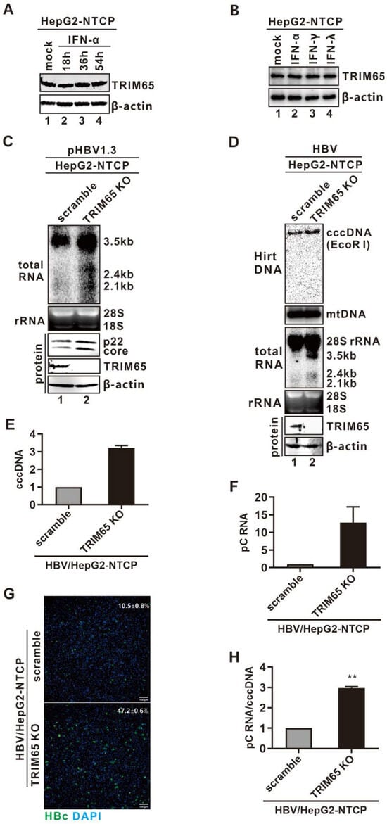 The effect of endogenous TRIM65 on HBV transcription. (A,B) Basal level of TRIM65 expression in hepatoma cells and its inducibility by IFNs. (A) HepG2-NTCP cells were left untreated or treated with human IFN-α (1000 IU/mL) for indicated time durations (18 h, 36 h, and 54 h). The untreated cells (control) were harvested together with the cells treated with IFN-α for 54 h. (B) Another group of HepG2 cells was left untreated (control) or treated with type I IFN-α (1000 IU/mL), type II IFN-γ (100 ng/mL), or type III IFN-λ (100 ng/mL) for 48 h (B). The levels of TRIM65 expression were determined by Western blot. β-actin expression was presented as loading control. (C) Knock-out (KO) of endogenous TRIM65 upregulates HBV transcription in virally transfected cells. HepG2-NTCP scramble control and TRIM65 KO cells were transfected with pHBV1.3 for 3 days, followed by Northen blot assay for HBV total RNA and Western blot analyses of HBV p22/core and cellular TRIM65 proteins. (D–H) KO of endogenous TRIM65 enhances HBV infection. HepG2-NTCP scramble control and TRIM65 KO cells were infected with HBV (100 vge/cell) for 6 days in the presence of 10 μM of 3TC, followed by the following assays: (D) total Hirt DNA was extracted, heat-denatured, and digested by EcoR I and subjected to Southern blot detection of the linearized cccDNA. Mitochondrial DNA (mtDNA) served as Southern blot loading control. Total RNA samples were subjected to HBV RNA Northern blot analysis. (E) An aliquot of the original Hirt DNA was heat-denatured and digested by PSAD to remove non-cccDNA species, followed by cccDNA qPCR quantification. The relative cccDNA levels were plotted as fold change compared to the scramble control group. (F) HBV pC mRNA in the total RNA samples was detected by qPCR. The relative pC mRNA levels were plotted as fold change compared to control group. (G) HBV cccDNA-based gene expression was assessed by HBc immunofluorescence; the average percentage of HBc-positive cells were calculated from five microscope fields of view. Nuclei were stained with DAPI. Scale bar: 100 μm. (H) The relative transcription activity of cccDNA was presented by normalizing pC mRNA level (F) to cccDNA level (E) and plotted as fold change compared to control group (mean ± SD, n = 3. ** p < 0.01).