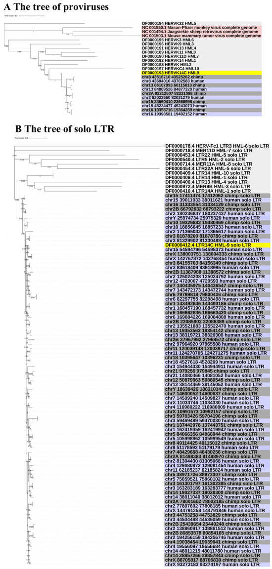 The nucleotide sequences of each identified HML-9 element were compared and analyzed using software and LTR14C-HERVK14C-LTR14C, and all insertions and deletions were annotated in a graphical representation of multiple alignments.
