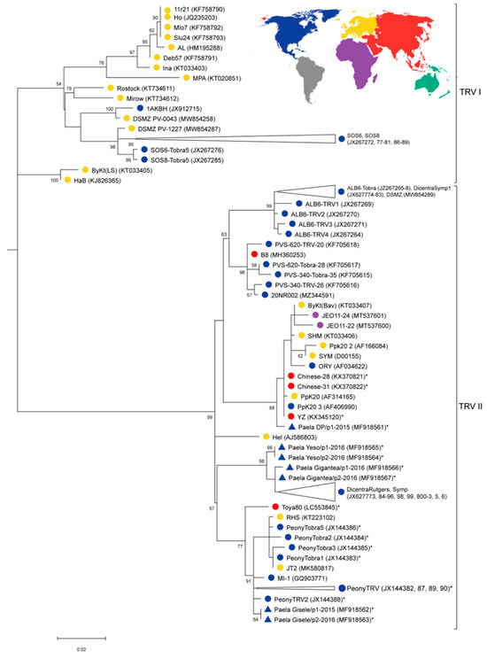 Maximum Likelihood phylogenetic tree depicting the relationships of TRV sequences isolated from peonies at the UMNA (blue triangles) and TRV sequences publicly available on GenBank, based on 799 bp of the RNA-polymerase gene region. The tree was built using the Tamura–Nei model [53] with invariable sites and gamma distribution (G + I). The Pea Early Browning Virus (PEBV) was used as the outgroup, and all nucleotide sites were included in the analysis. The numbers next to the nodes represent the branch support (1000 bootstrap replicates). Sequences isolated from the Paeonia genus (P. lactiflora or P. suffruticosa) are indicated with an asterisk (*). The color labels correspond to the broad geographical location of samples on the map. Sequences in some closely related clusters were collapsed, but all accession numbers are included in the label.