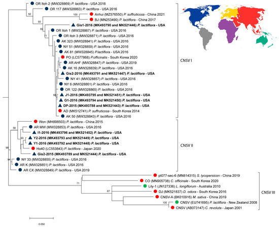 The CNSV phylogenetic tree grouped sequences of all isolates from UMNA in two well-supported clades (labeled CNSV I and CNSV II in Figure 3). Clade CNSV I contained five isolates from Michigan and sequences isolated from P. suffruticosa (AD and Anhiu isolates) and P. officinalis (PO) from South Korea, and P. lactiflora (BJ) from China and other USA locations (Oregon, New York, and Alaska; Figure 3). Clade CNSV II contained sequences isolated from P. lactiflora from Japan, China, and the USA (Arkansas and New York). These two clades were separated from another containing one isolate from P. lactiflora from New Zealand and isolates from different plant species in Australia, China, Japan, and South Korea (Clade CNSV III, Figure 3).