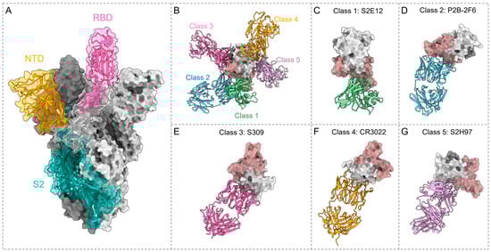 The antibody S2H97 exhibits high-affinity binding to a cryptic conserved epitope across all sarbecovirus clades, which is designated as site 5 (Figure 2G). This binding requires a substantial opening of the RBD to expose its specific epitope, accelerating the transmission of spike protein to the postfusion conformation and effectively inhibiting viral entry. S2H97 effectively neutralizes diverse sarbecoviruses and SARS-CoV-2 variants, including Omicron BA.1 [61]. The antibody XMA09 exhibits high epitope similarity with S2H97 and maintains comparable neutralizing capability against the Omicron pseudovirus to that of D614G [98]. ION_300 binds to a distinctive region on the opposite side of the RBM, obscured by the NTD of an adjacent S1 polypeptide chain when the RBD is in the closed conformation [99]. Analysis of epitope sites predicts that this antibody is expected to maintain binding and neutralization potency against prevalent RBD mutations, such as K417N/T, E484K, and N501Y [99]. The nAbs WRAIR-2057 and WRAIR-2063, isolated from a convalescent donor, can potently neutralize SARS-CoV and SARS-CoV-2. Moreover, they retain neutralization against various Omicron subvariants, including BA.1, BA.2, BQ.1.1, and XBB.1.5 [93,100]. The epitope of WRAIR-2057 exhibits 48% overlap with S2H97 and 70% with ION_300 [93]. The epitope of WRAIR-2063 is accessible only when one or more RBDs is in the “up” conformation, which may facilitate the shift of spike protein from prefusion to postfusion, resulting in the rapid disintegration of the S trimer [97,101]. The superimposition of the WRAIR-2063–RBD complex onto the RBD of the S trimer reveals no significant steric clashes with RBDs of the adjacent protomers, suggesting that multiple WRAIR-2063 antibodies could bind to the S trimer [97]. The antibodies FD20, 7D6, and 6D6 show a similar neutralization mechanism to that of WRAIR-2063, which involves disassembling the spike protein [97,101]. FD20, isolated from a COVID-19 convalescent patient, can neutralizes Alpha, Beta, Gamma, and Delta [97,101]. The murine cross-neutralizing antibodies 7D6 and 6D6 showed almost consistent neutralizing efficacy against Alpha, Beta, and Gamma variants. The binding of 7D6 and 6D6 with the RBD causes steric hindrance with the adjacent NTD, thereby disrupting the viral spike [97,101,102]. Furthermore, research demonstrates that the interaction of the S protein with CR3022 and other antibodies recognizing cryptic epitopes is notably improved when WRAIR-2063 is present, suggesting that engagement with WRAIR-2063 induces conformational alterations in the S trimer, thereby affecting accessibility of these cryptic sites [97]. This may indicate that binding of class 5 antibodies leads to more significant conformational rearrangements in the S trimer, ultimately impacting neutralization effectiveness and breadth of antibodies that aim at associated epitopes.