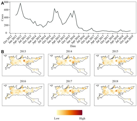 Human dengue cases reported from 2013 to 2018 in Ibagué. (A) Time series of the aggregated cases for the whole city. (B) Kernel density estimation for the georeferenced cases for each year of the studied period.