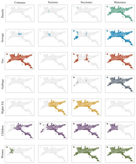 The GWR analysis revealed a significant association for seven critical variables at a minimum of one spatial level over different years (Figure 2). These variables encompassed critical aspects of the socio-economic landscape, including population density (Density), sewage connection (Sewage), gas connection (Gas), garbage collection service (Garbage), the population with higher education degrees (Higher Ed.), the percentage of women (Women), and the percentage of children (Children).