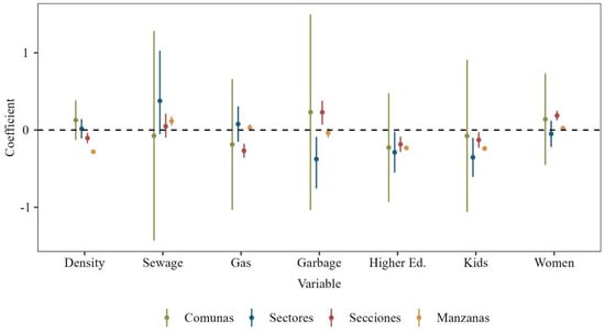 At the Secciones level, most spatial variables exhibited significance, with garbage collection and the percentage of women showing negative correlations with dengue cases. This inverse relationship suggests that areas with more efficient waste management and a higher proportion of women tend to have lower dengue prevalence. Moreover, factors such as higher population density, gas connections, education levels, and the percentage of children consistently demonstrated negative correlations with dengue cases, thereby echoing the trends observed at the Sectores level and underscoring the influence of these variables on disease incidence.
