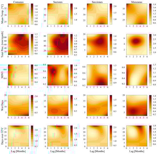 The days over 32 °C exhibited a comparable trend with the mean temperature, where a higher frequency of hot days at shorter lags was linked to an increased RR. The same relationship was displayed by the number of wet days and total precipitation, with increased RR at two- and six-month lags, reflecting the bimodal rainy seasons. Finally, the NDVI showed irregular patterns, with minimal variation at broader levels like Comunas and Sectores due to its non-seasonal nature.