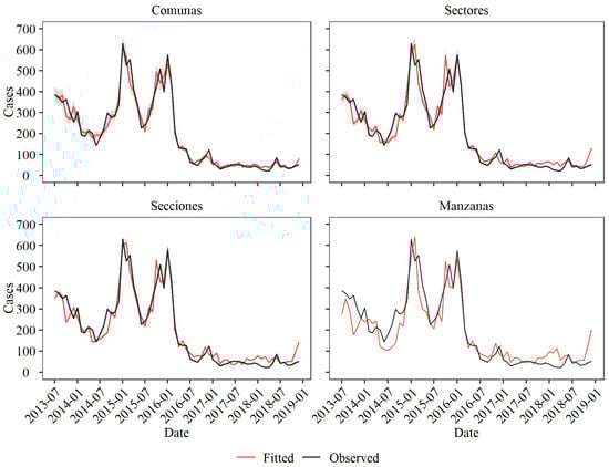 A lower RMSE was found for the Comunas level since it provided the best overall fit (Table 2); however, the level of Secciones provided a lower RMSE than the Manzanas and Sectores levels, which might be due to the better fit exhibited during epidemic seasons.