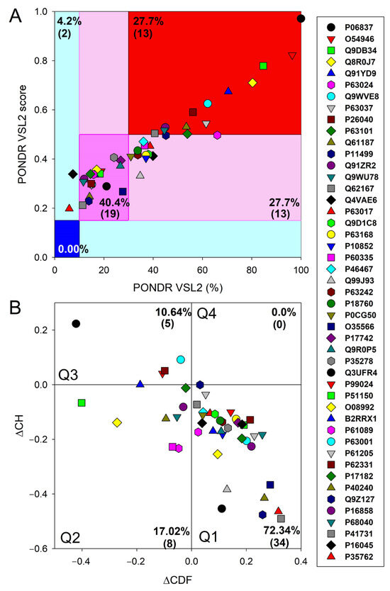 Multifactorial intrinsic disorder analysis of mouse proteins entrapped in RABV particles. (A) PONDR® VSL2 score vs. VSL2 PONDR® (%) analysis: PONDR® VSL2 (%) is a percent of predicted disordered residues (PPDR), i.e., residues with disorder scores above 0.5. PONDR® VSL2 score is the average disorder score (ADS) for a protein. Color blocks indicate regions in which proteins are mostly ordered (blue and light blue), moderately disordered (pink and light pink), or mostly disordered (red). If the two parameters agree, the corresponding part of the background is dark (blue or pink), whereas light blue and light pink reflect areas in which the predictors disagree with each other. The boundaries of the colored regions represent arbitrary and accepted cutoffs for ADSs (y-axis) and the percentage of predicted disordered residues (PPDRs; x-axis). (B) Charge–hydropathy and cumulative distribution function (CH-CDF) analysis of entrapped host proteins: The CH-CDF plot is a two-dimensional representation that integrates both the CH plot, which correlates a protein’s net charge and hydrophobicity with its structural order, and the CDF, which cumulates disorder predictions from the N-terminus to the C-terminus of a protein, offering insight into the distribution of disorder residues. The y-axis (ΔCH) represents the protein’s distance from the CH boundary, indicating the balance between charge and hydrophobicity, while the x-axis (ΔCDF) represents the deviation of a protein’s disorder frequency from the CDF boundary. Proteins are then stratified into four quadrants: Quadrant 1 (bottom right) indicates proteins likely to be structured; Quadrant 2 (bottom left) includes proteins that may be in a molten globule state or lack a unique 3D structure; Quadrant 3 (top left) consists of proteins predicted to be highly disordered; and Quadrant 4 (top right) captures proteins that present a mixed prediction of being disordered according to CH but ordered according to CDF.